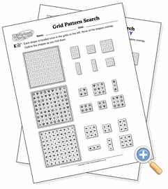 This puzzle helps students develop problem solving skills using imagery. Each puzzle grid is filled with a handful of unique patterns which may range from very easy (numbers) to very hard (nearly identical scribbles). The student will need to devise their own way to search for the patterns in the grid.