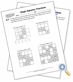 A magic square worksheet contains three or four puzzles (it is up to you if the first one serves as an example), each one a row and column larger than the last. Select the starting cell size to determine how large they get.