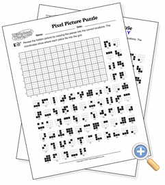 This is a pixel picture puzzle of an image of a grasshopper. The picture is hidden on a 39 x 21 cell grid, which makes it a fairly simple puzzle to complete. The puzzle pieces must be found by their coordinates and filled into the grid to reveal the picture.
